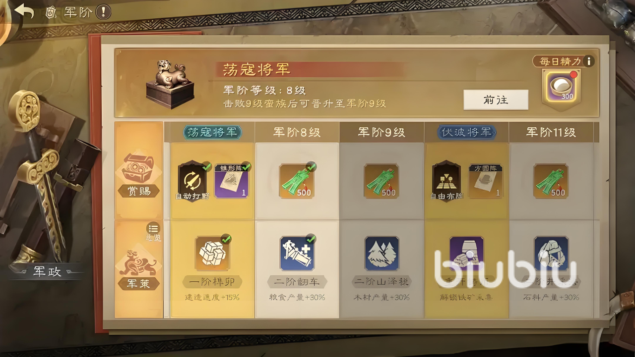 完成阵容搭配后,就可以去讨伐蛮族了,击败蛮族解锁的叛军是获取武将军阶经验、提升等级的主要途径。叛军等级越高,获得的经验越多。另外还有自动打野功能(军阶8级解锁),用了后可以解放双手,挂机刷野。由于口粮前期有限,建议优先集中提升主力队伍的等级,待主队等级达到40级后,再考虑培养其他队伍。