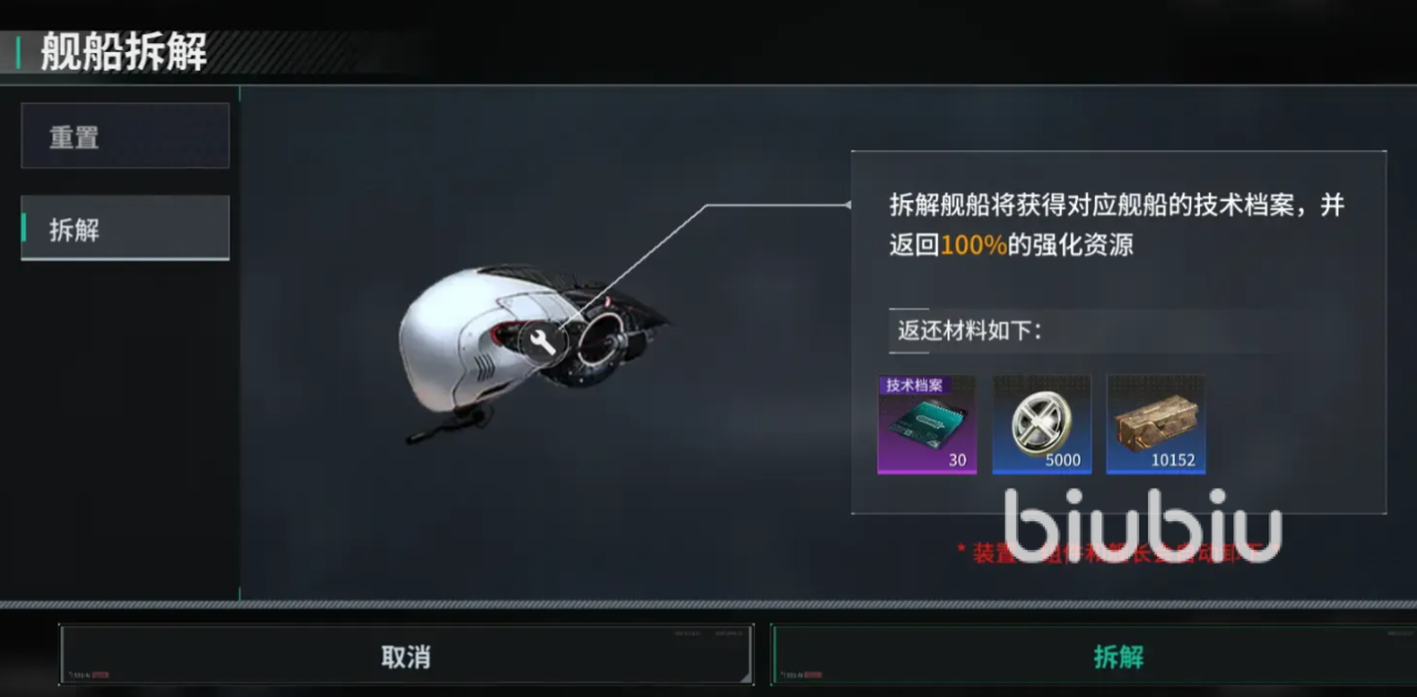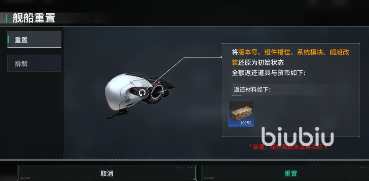 点击进入后能看到重置、拆解两个不同的选项,重置会将组建槽位、系统模块、舰船改装等还原成初始状态,获得一些基础材料和组件,这些可都是宝贵资源,选择拆解的话除了返还材料外,还能拿到对应舰船的技术档案。