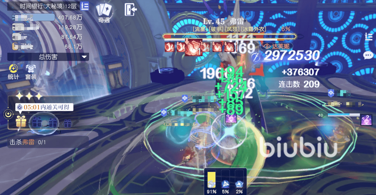 副本大秘境7层以上会掉落54级的顶级散件,但是想要掉装备则需要三星,所以应当以三星为目标,建议血量在2w以上闯关,如果不够可以适当装备血宝石或者高等级的防具,2w4以上最好,这样能确保在中大部分技能后不直接死亡,极大提升容错率,此外建议把小地图右上角的dps统计打开,调整为每秒伤害的页面,确保团队打boss时候的总dps在5w以上,如果不够的情况下,可以适当去刷取1到3层的紫色散件来提升,这样才能成功三星。