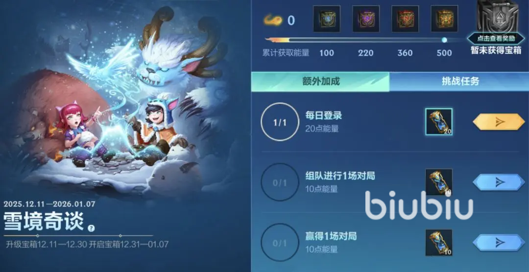 召唤师参与活动就能提升宝箱品质,最高级别的宝箱是钻石宝箱,打开就能随机获得一个史诗皮肤。活动分为不同时期,首先是宝箱升级时期,12月11日到12月30日完成活动任务就能获取能量,用来升级宝箱品质;