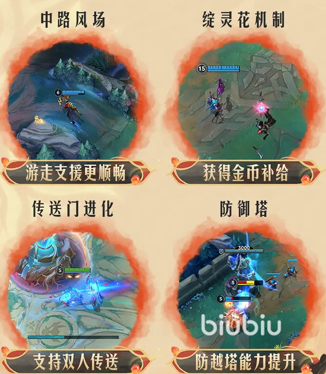 同时,之前十分经典的先锋以及大龙的BUFF也在此次的版本更新之后而回归。这里主要改动里面有四个是提到最多的,第一个是在游戏的中路增加了风场,这个风场英雄在经过的时候移动的速度会加快。这样不管是进行袭击还是支援都会减少一些时间。第二个改动是绽灵花。更新之后我们在地图上可以看到这种花朵,在攻击之后我们可以获取到额外的金币补给。