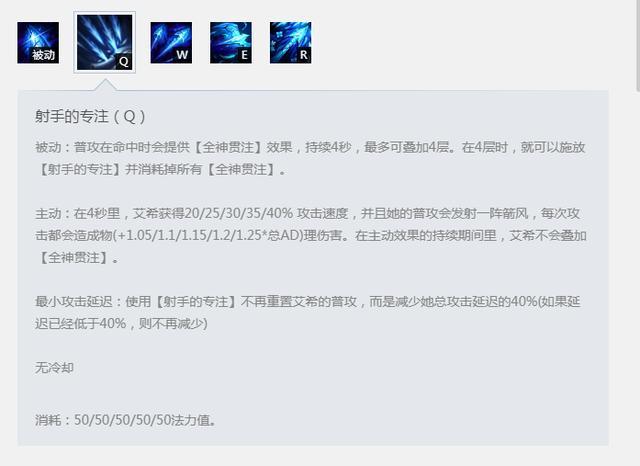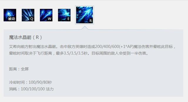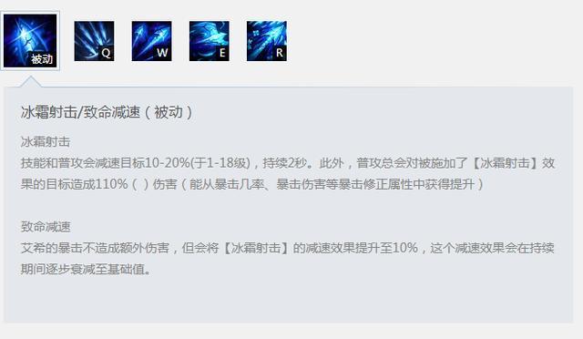 寒冰的Q技能会提高攻速,并且一个普攻分成5次输出,但只能对装备被动和攻击特效触发一次。虽然艾希的主要输出和爆发都来源于此,但是技能本身伤害并不是太高,主要是为了触发被动的额外伤害。