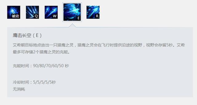 E技能是一个侦察技能,毕竟艾希没有位移,意识不到位的话就很容易被针对,意识越好这个技能就能应用的更好,关键时刻用来提供视野,保护自身并提醒队友,削弱对方打野骚扰能力。