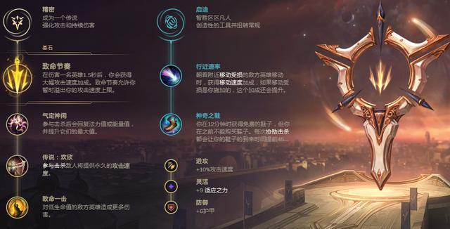 这一套符文中,致命节奏是最契合寒冰的基石天赋, 艾希对线期的蓝量不是很够用,在不出夺萃之镰的情况下,带气定神闲的效果比较好。如果是对局被抓压力不大,则可以带过量治疗,对拼较多则带凯旋,有奇效,其次行进速率是寒冰必带天赋,可以省钱加移速,也能根据自己喜好替换成饼干或秒表。