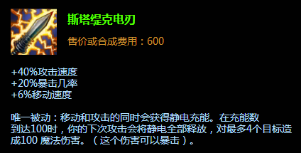 薇恩最重要的一个属性是攻速,所以建议再给薇恩搭配上一件电刀,因为目前羊刀并没有上线手游,所以电刀也能契合薇恩对暴击和攻速的需要,而且电刀打出的闪电效果能增强薇恩的清线能力,因为本身薇恩的推线能力就不够强。