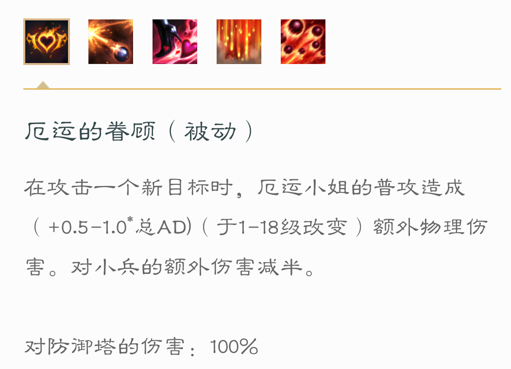 增添本身攻击速度,爆击和移速,与此同时增添攻击间隔,增添本身输出能力,另外伤害搭配厄运小姐的被动技能,能带来巨额的伤害。