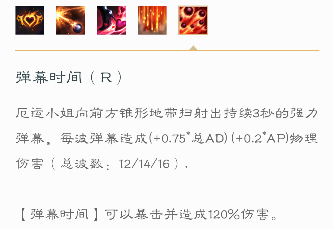 R技能的时候厄运小姐的关键技能,技能射程广,因为技能可发生爆击,搭配上无尽的巨额暴伤加成,这波团战,只要放好这波弹幕时间,就可以轻轻松松赢下团战,迈向成功。