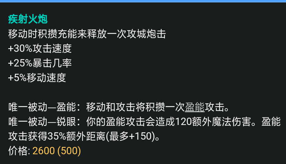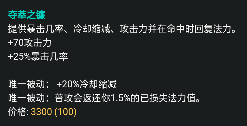 关键装备:夺萃之镰+无尽之刃+疾射火炮。