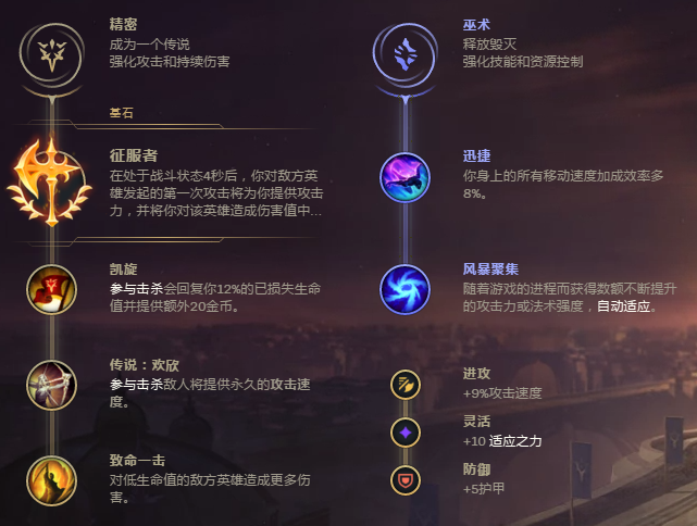 PS:德莱文三件装后的【征服者】作战状况下四秒后的三秒内,带来6-35攻击力和20%真伤,对脆皮来讲是这场恶梦,一把刀下来根本上是大残以至一把刀一击必杀,并且【迅捷】能非常好符合了W技能的移动速度。