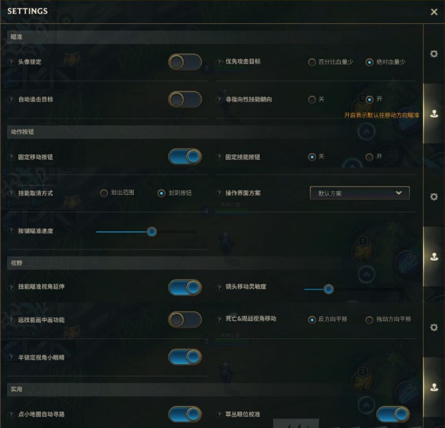 2、操作界面设置:瞄准、行动按键、视野、草丛眼位校准的设置(根据中文界面对比设置)