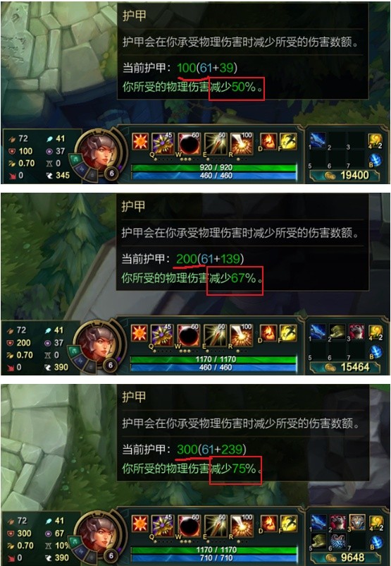 能够见得护甲越高,所获取的免伤收获便会减少。这儿就提醒大家,不要一心的死叠护甲,叠到一定水平就没法提高了(敌人有暴击的时候另说)