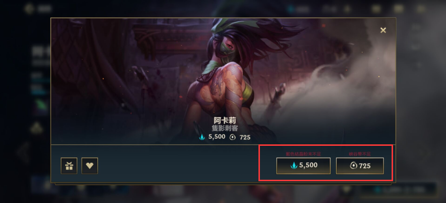 我们知道新玩家开始玩的时候,每升一级会送一个新英雄,但是到了十级之后就没有了。阿卡丽这名英雄不在新手赠送的英雄当中,想要拥有阿卡丽只能通过商店购买获得,首先我们进入商店,然后点击阿卡丽界面,就会发现右下角有一个购买阿卡丽的价格,分别是使用蓝色精粹和使用峡谷币的方式。