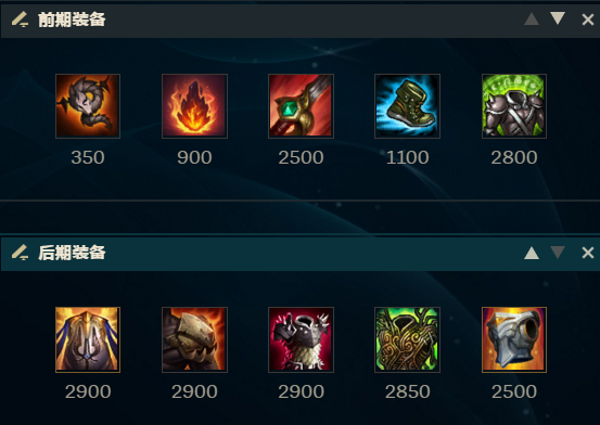 蒙多在水银鞋后先出振奋铠甲,这是他的关键装备,特别在敌人早期没重创装备以前,蒙多能够灵活运用自身的恢复力量打小规模对决。第三件装备通常为兰顿之兆或者亡者的板甲,将自身的护甲也撑起来。尽管是1个坦克英雄,但这一个版本的后半期伤害高得难以想象,敌人如果被黏上的话就非常难跑掉。后期能够补狂徒铠甲+石像鬼石板甲的搭配,也能够出荆棘之甲抑或适应头盔争对阵容,顺风局虐菜能够出寒霜战锤和黑色切割者。