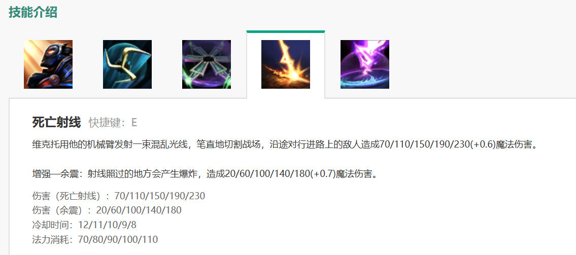 三技能技能,死亡射线,维克托的招牌技能。主要用激光打出一条线,不仅能切割战场,还能对线上的敌人造成伤害。也可以使用三技能打乱小兵的排列。一个熟练的维克托,重点就是掌握死亡射线的范围和技能释放距离。