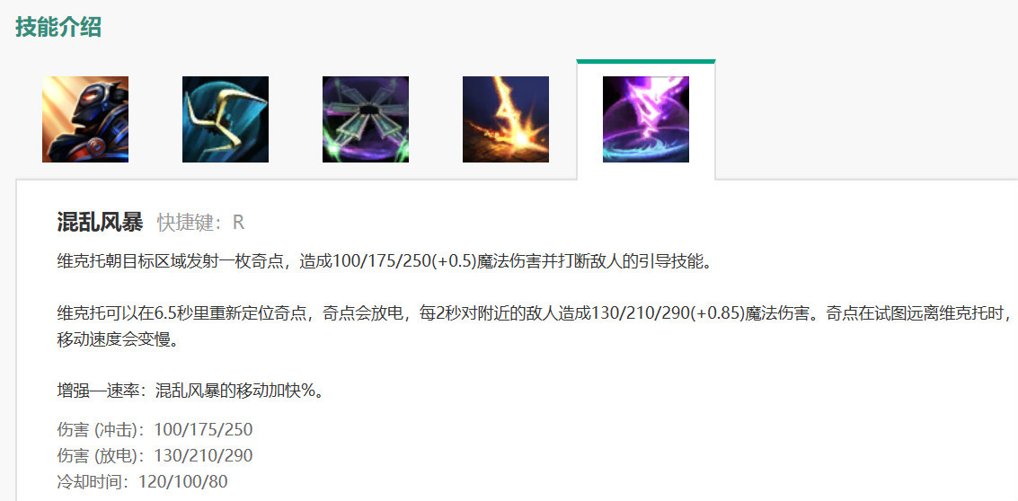 维克托的大招,混乱风暴可以造成敌方英雄沉默的效果和伤害。团战时效果显著,不过大家要注意使用维克托时,无论技能早放还是晚放,在死之前一定要把技能用完,打出自己的伤害,这样才是一个合格的中单。另外控制好混乱风暴的奇点,前期虽然伤害一般,但后续的伤害还是很不错的。
