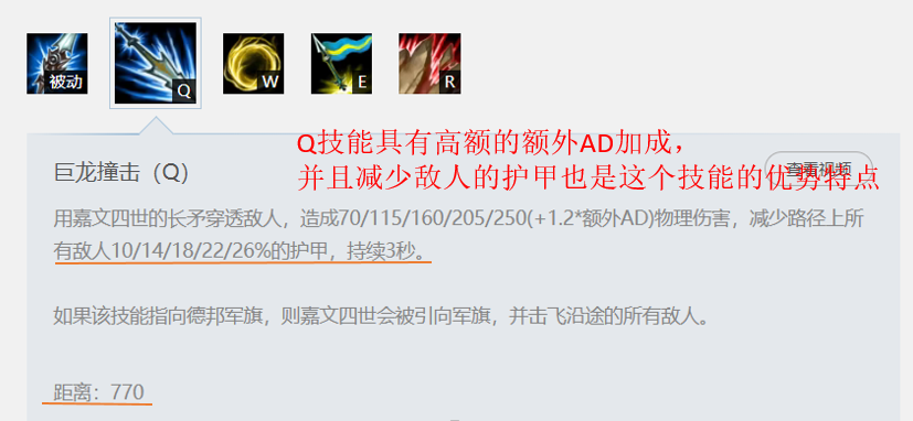 Q技能-【巨龙撞击】,皇子用长矛透过对手,带来物理伤害,并降低途径上全部对手一定的护甲,持续3秒,此技能得到巨额的1.1额外的AD加成。