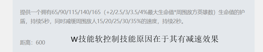 而且W技能会跟着对手数目的多少增添,即是+20/30/40/50/60×四周对手数目,假如W为1级,四周有五个人,辣么W便会获取另外的一层层20×5=100的血量防御盾。