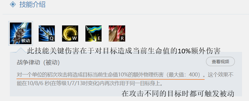 被动技能-【战争律动】,皇子的普攻攻击附有指定目标当今血量10%的额外伤害(至多带来400伤害),而且被动的重置时间其实不长,因此上路2个近战英雄拼消耗皇子是占优势的。