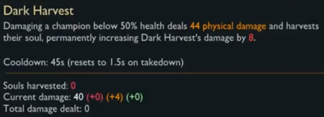 在修复补丁后,黑暗收割的伤害成了40-80(随等级提升)(+0.25额外战士)(+0.15AP)(+灵魂数x5),刚公布时候基础伤害是50,每个灵魂提高8点伤害,S9季前赛第一天的游戏,是全民暗中收获的情况。但即使进行削弱后,估计黑暗获得仍旧是一个中后期极强的符文。