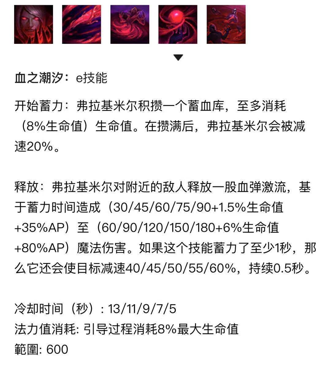 吸血鬼的三技能是血之潮汐,摁住以后吸血鬼会消耗自己血量并且进行蓄力,对范围内的敌人造成伤害,蓄力时间越长伤害越高。