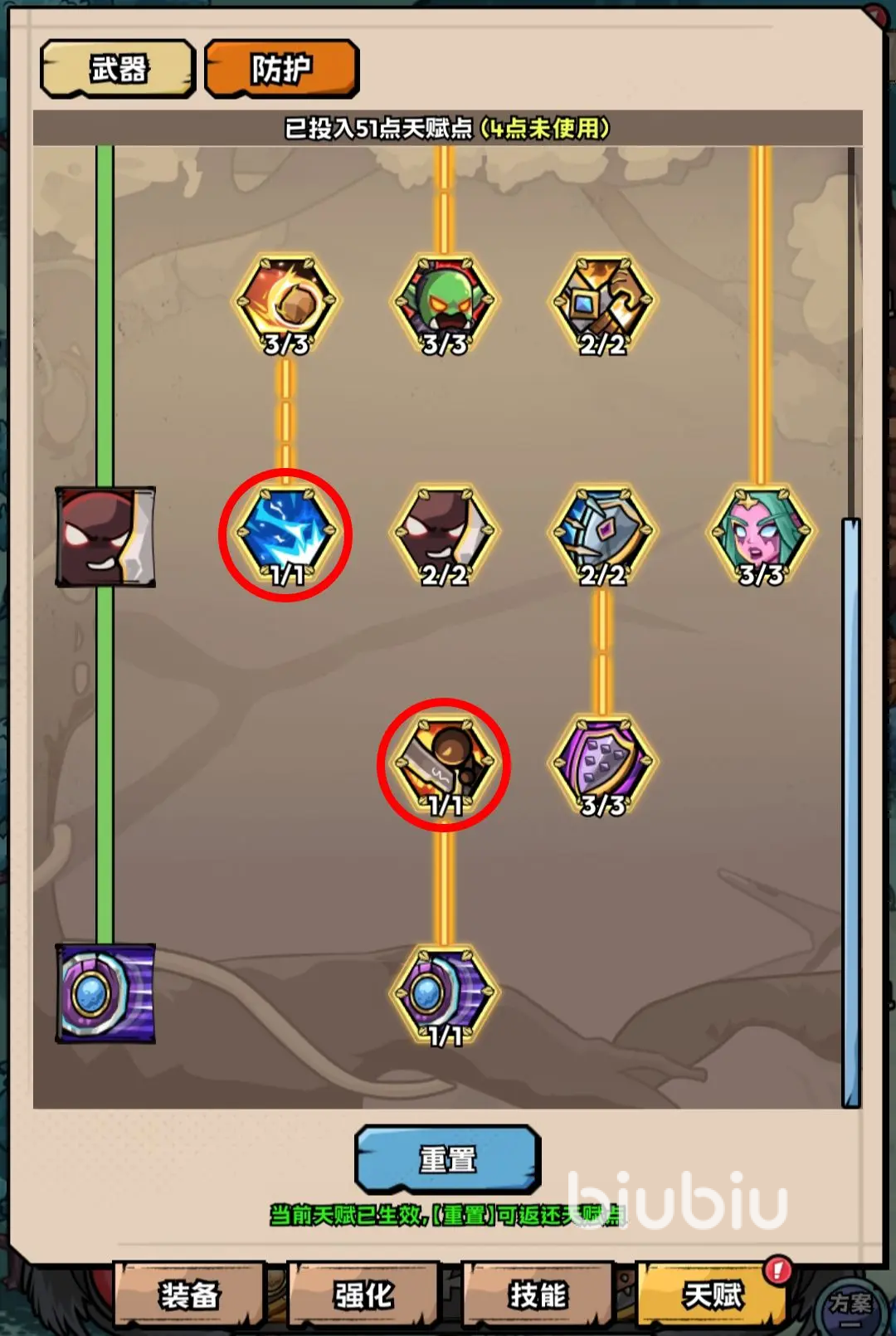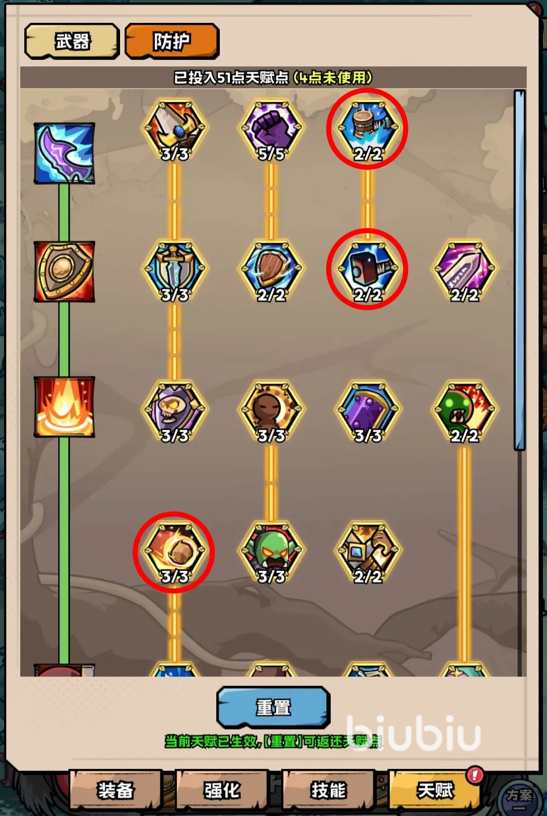 天赋的选择也很重要,防护天赋比较推荐平民选择,属性不算太高,可利用这个天赋降低CD以及流血效果,提高挂机的效率;天赋加点方面优先和群怪效率相关的就好,比方说增加雷霆冲击伤害,减少冷却时间。
