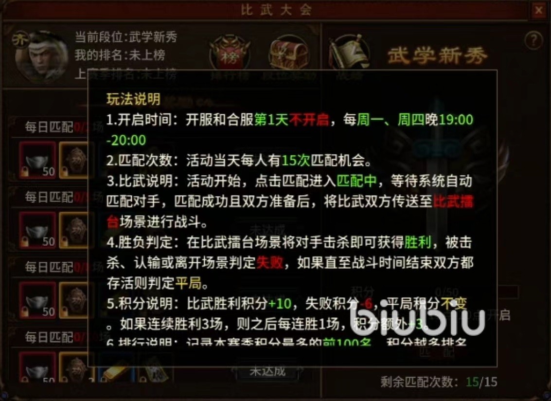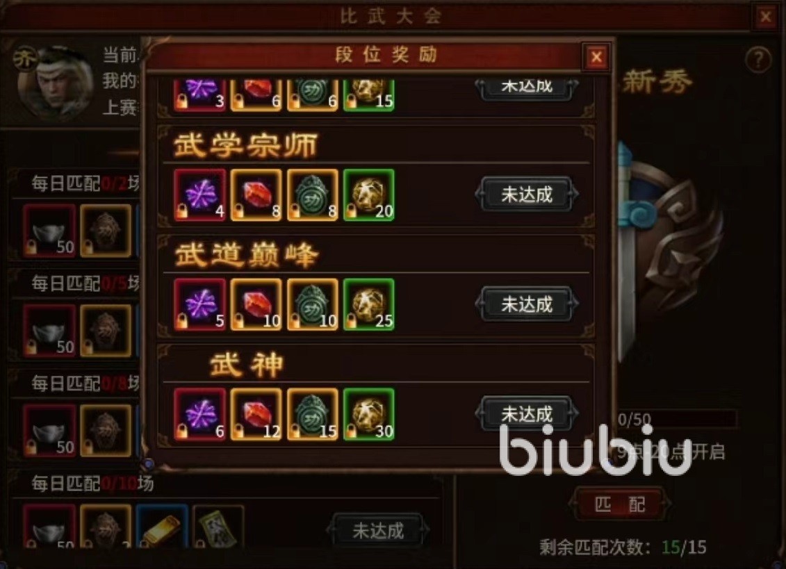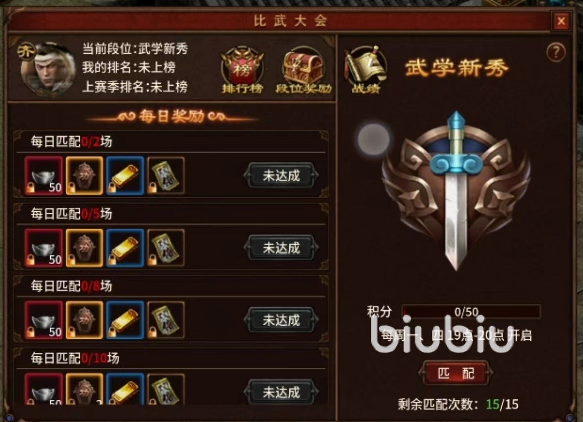 比武大会也分为不同段位,当玩家刚刚加入的时候,将会获得武学新秀的称号,这也是最低等级的段位。通过比武大会功能,点击匹配就可以自动进行战斗。每天达到一定匹配场次,即使不获胜也可以获得相应奖励,这也算是大多数玩家的保底。后续段位包括武学高手,武学强者,武学大师等,每达成一个新段位,还有相应奖励发送,最后称号达到武神,就是整个服务器的巅峰。