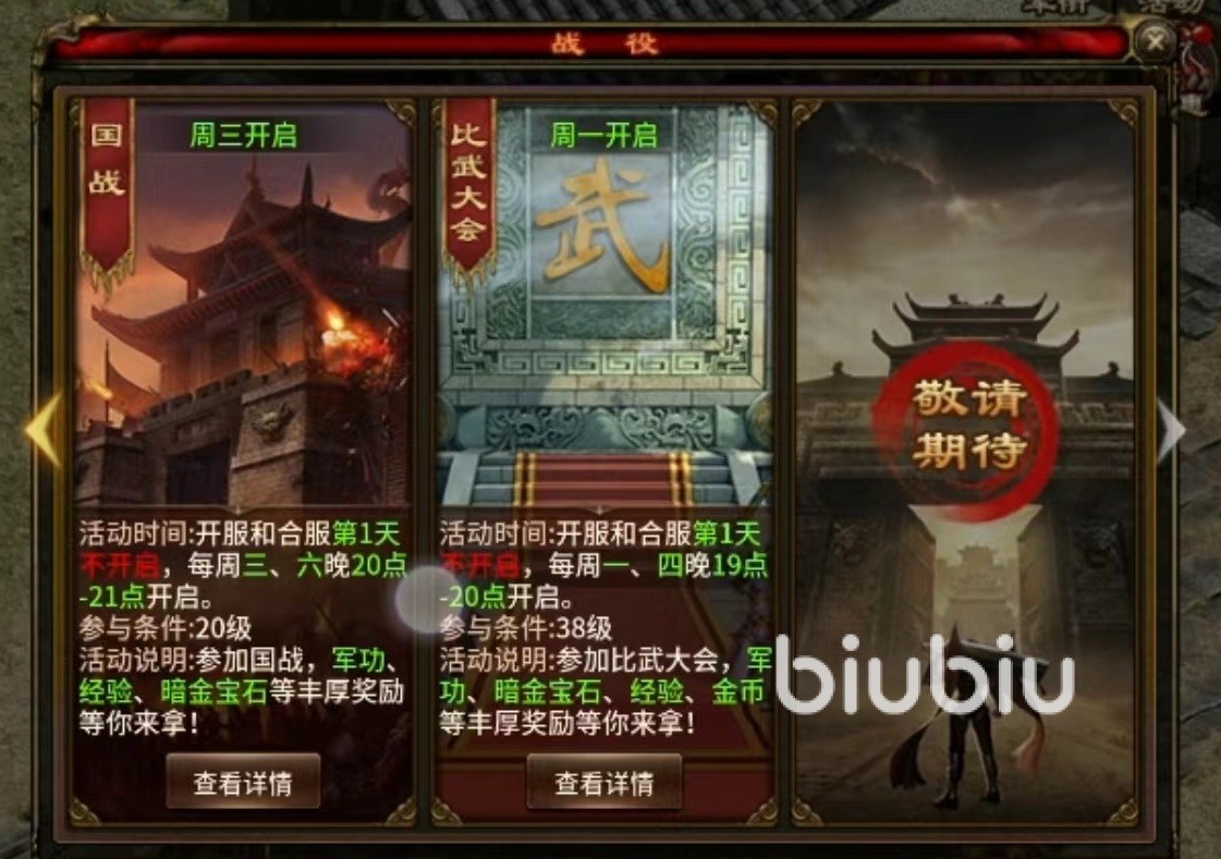 首先这项活动并不是每天都开放,而是在每周周一和周四晚19:00~20:00开启,但如果是新开服或者是服务器进行了合并,那么第1天将不会开启,这一点和家族战是有区别的,大家要重点记住。凡是等级达到38级以上的玩家都可以报名参加,奖励内容包括暗金宝石、经验等,只要参与就可以获得奖励,名次越高奖励越好。