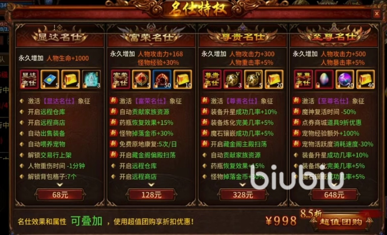 目前一共提供了4种不同特权和称号供大家选择,最初的是显达名仕,后续为富荣名仕,尊贵名仕和至尊名仕。显达名仕需要充值68元后获得,能永久增加1000点人物血量,开启远程仓库,远程商店,可以自动出售装备,喂养宠物,能在交易行上架,还会解锁更多背包格子。充值128元将激活富荣名仕,永久增加人物168点攻击力,以及30%打怪物经验,还将自动进行家族资源贡献,使用药水恢复效果提升,打怪掉落金币提升,给予每天5次原地健康复活的机会,同时开启藏经阁偏殿扫荡。