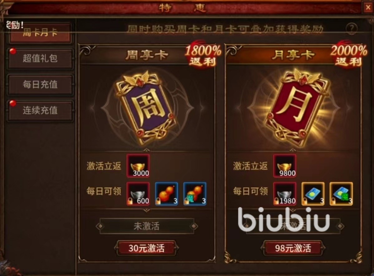 充值328元开启尊贵名仕,人物攻击力永久增加30点,人物重击率永久增加5%,进行装备培养的时候,升星成功率提升,炼化完美率提升,镶嵌成功率提升。最后是充值648元,直接激活至尊名仕,永久增加50点人物攻击力,5%人物暴击率。接下来是魔神复活时间减少50%,在点券商城购买道具时打9折优惠,宠物额外获得100%经验,宠物活跃度消耗速度降低30%。
