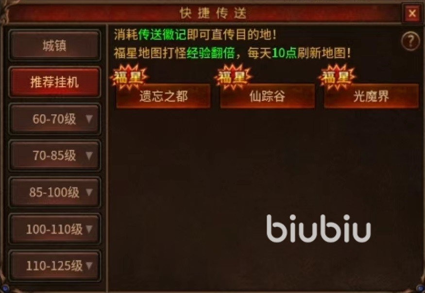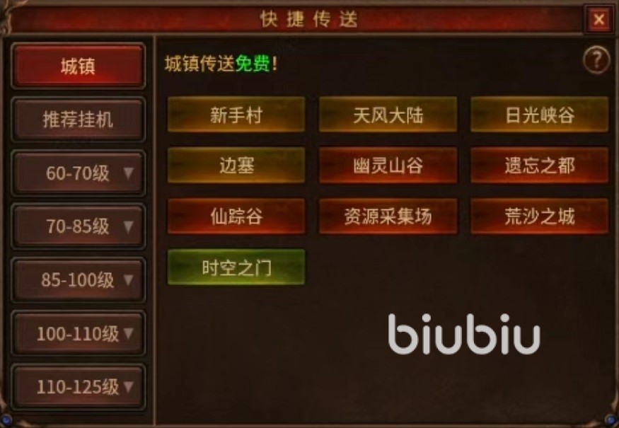 但如果在没有任务需求的情况下,如果想要直接达到指定地点,那么就需要利用快捷传送功能。在主页面右边可以找到传送选项,点击之后这里有目前所有对应场景,分别是城镇、推荐挂机、60~70级,70~75级等不同分类。大家可以从中查找到自己想要去的地方,其中城镇又包括新手村,天风大陆,幽灵大陆,荒沙之城等,点击之后直接就能传送过去,当然也需要消耗道具。