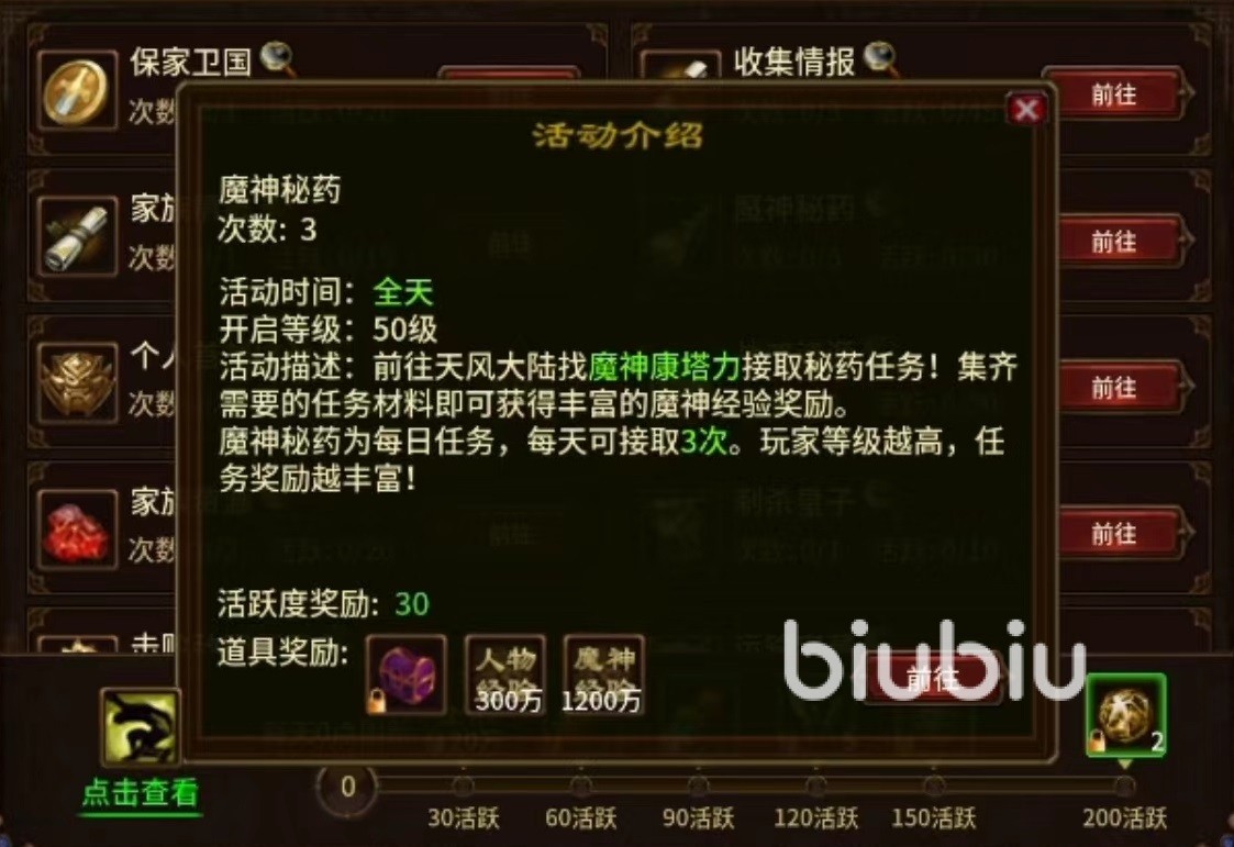 需要的任务道具,有些需要去搜集,也有一些需要通过其他途径搞定,但都属于常见类型,大家也可以在自己背包中多准备一些。这样可以直接将三次任务全部完成,节省时间。进行活动的等级越高,任务奖励也就越丰富,可以将这项活动放到每天后面完成,这样先去升级,提高等级之后自然奖励也就更多,完成此任务后能够获得活跃度。