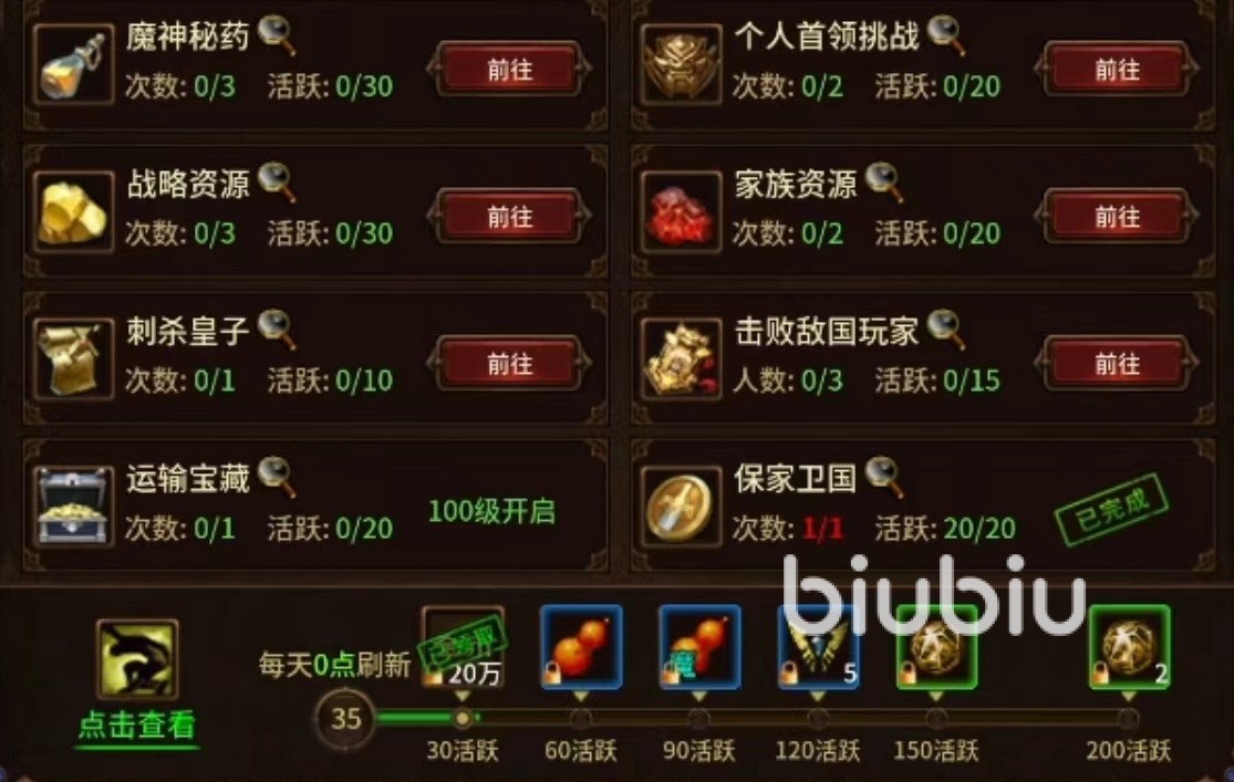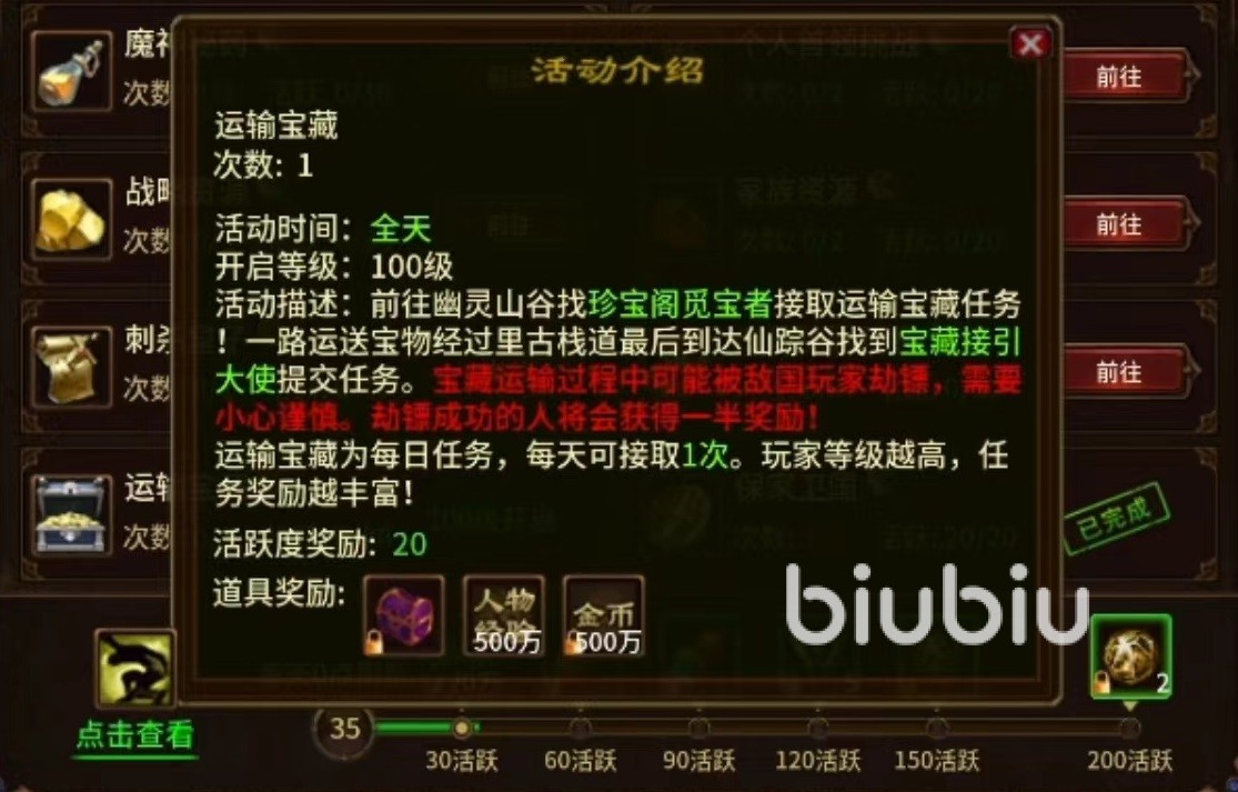 大家打开日常任务后拉到最下面,就可以看到运输宝藏的活动提示,这是当角色达到100级时才会开启的高级活动,每天可以完成一次,每次增加20点活跃值。该活动属于全天开启类型,需要大家前往幽灵山谷,在这里找到相应的npc,然后接取运输任务,将其一路运送到宝藏大使这里提交。