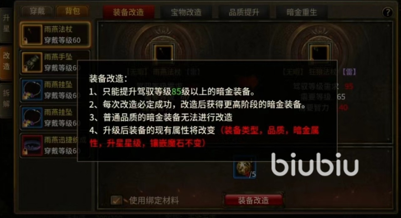打造之后必定会获得成功,然后能获得更高阶段的暗金装备,如果是普通品质的暗金装备,无法进行打造。升级之后,装备现有属性将改变,但是类型、品质、暗金属性,升星星级等不会进行改变,只是改变当前的属性。打造只能够在等级85以上的暗金装备中进行,低于85级则无法进行操作。