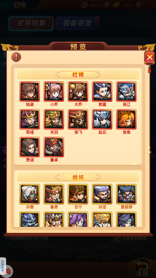 2、高级招募:可获得紫、黄、橙、红品质武将,其中橙品质武将就是六星武将,红品质武将就是七星武将。可招募红武将为小乔、大乔、郭嘉、张辽、陆逊、荀彧、关羽、张飞、赵云、张角、贾诩、董卓。可招募的黄色武将和普通招募是一样的。