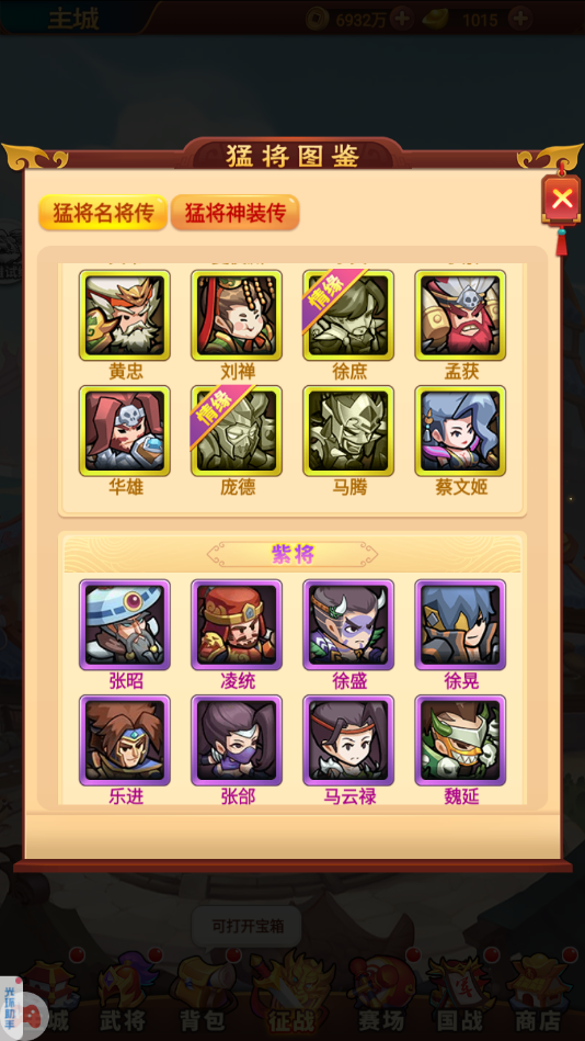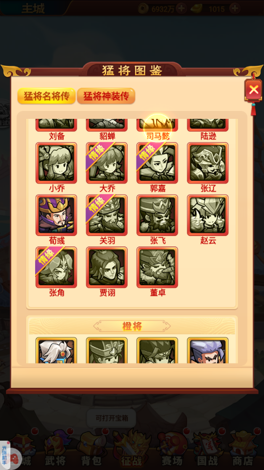 3、橙色武将:可招募的橙色武将为孙策鲁肃、甘宁、孙坚、夏侯惇、曹仁、许褚、甄姬、姜维、马超、黄月英、华佗、法正、汉献帝、袁绍、陈宫。