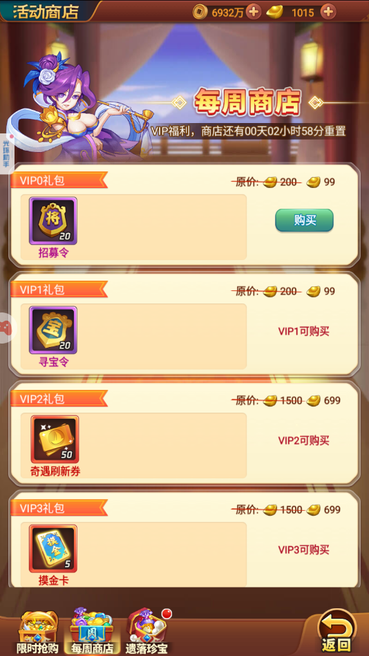 2、每周商店主要是VIP福利,不过奖励都还是好,可以买的的话就不要客气了。