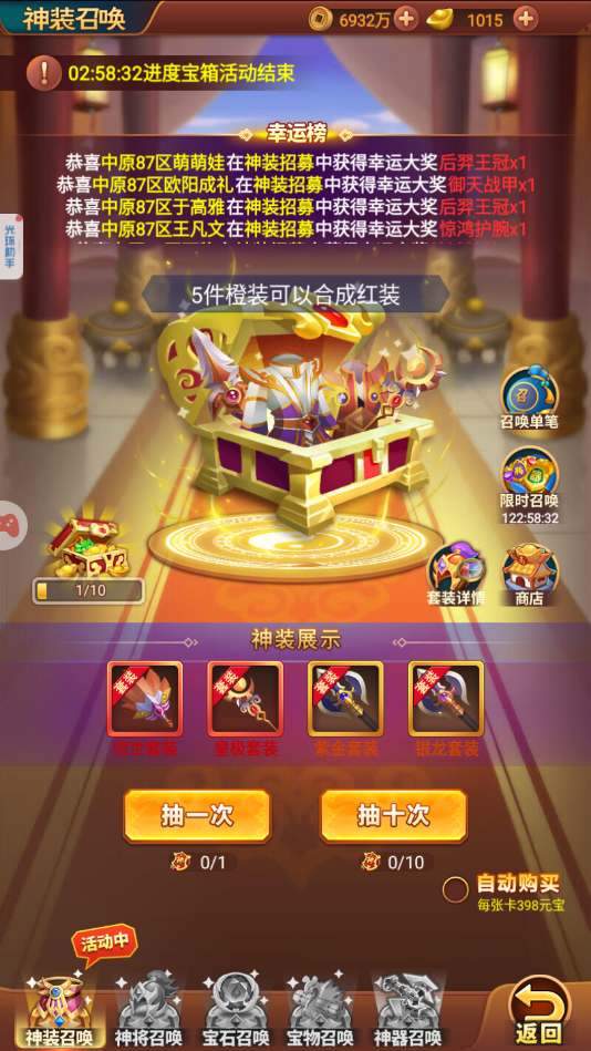 3、概率公示:神装召唤:神将&名将1%;7星武将10%;6星武将44%;武将卡18%;5星武将27%;神殿币100%。