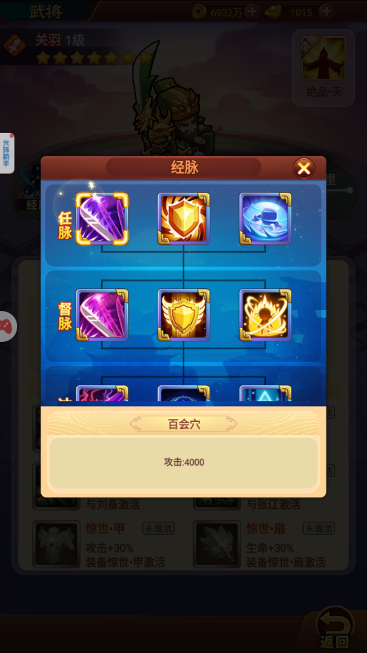 (1)任脉:百会穴攻击力+4000、神庭穴护甲力+6000、太阳穴生命值+30000。