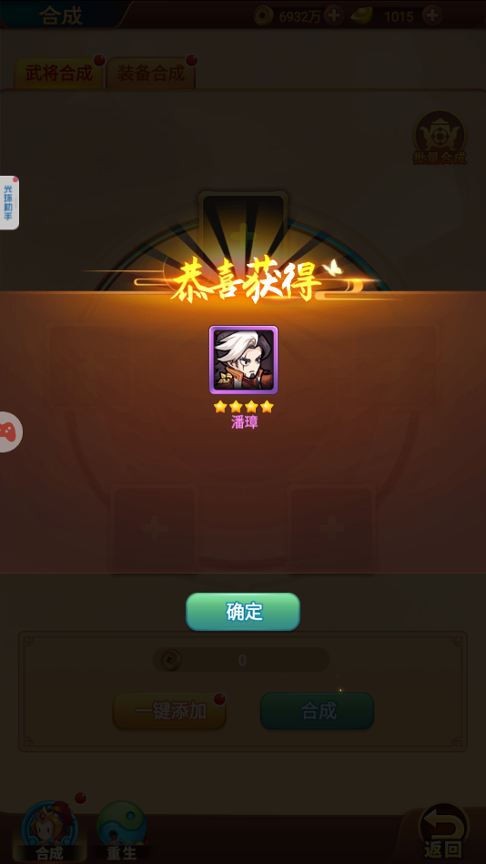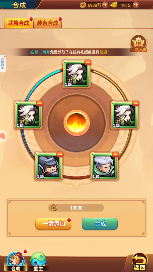 (2)合成方法:五个武将或者是装备可以进行合成,可以从最低的两心英雄直接合成到最稀有的七星红将,只要大家每天固定上限,还是很容易达成的。