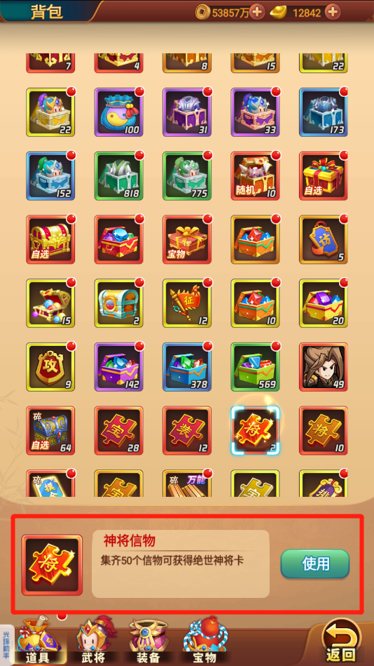 2、当玩家集齐足够的神将信物,就可以进入到游戏的主页面点击“背包”按钮,在背包的道具一栏可以找到“神将信物”,点击“使用”按钮即可把五个是神将信物合称为绝世神将卡。