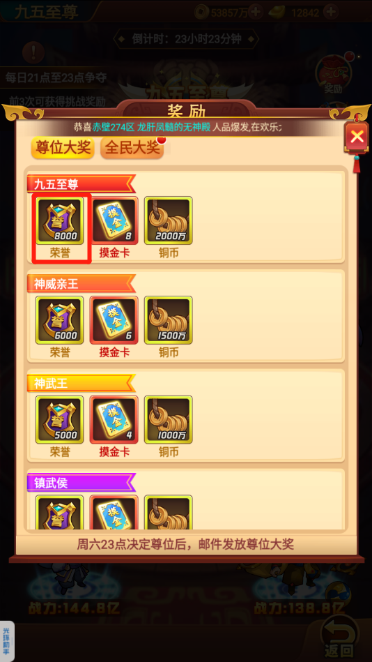 3、皇城商店:1W皇城币可以兑换一个绝世神将卡,奖励兑换的话只需要8000皇城币。