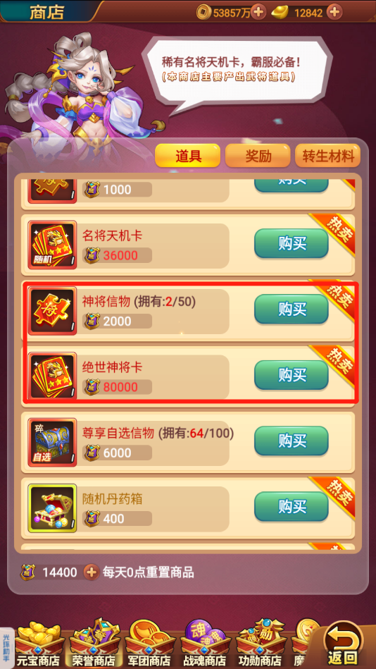 4、中原商店:2W中原币可以兑换一个绝世神将卡。