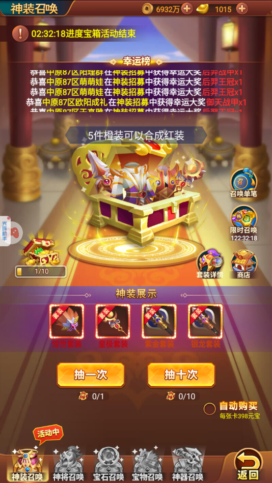 3、概率公示:神装召唤:神将&名将1%;7星武将10%;6星武将44%;武将卡18%;5星武将27%;神殿币100%。