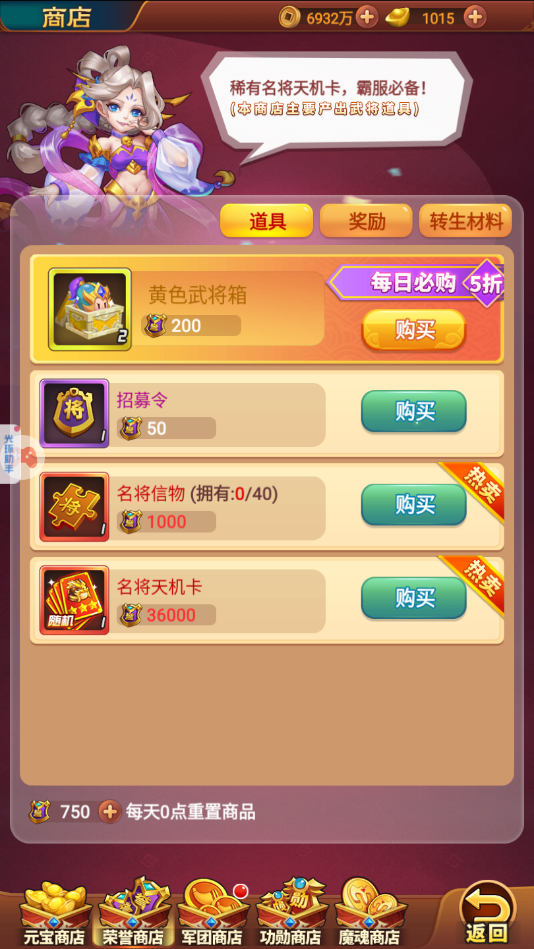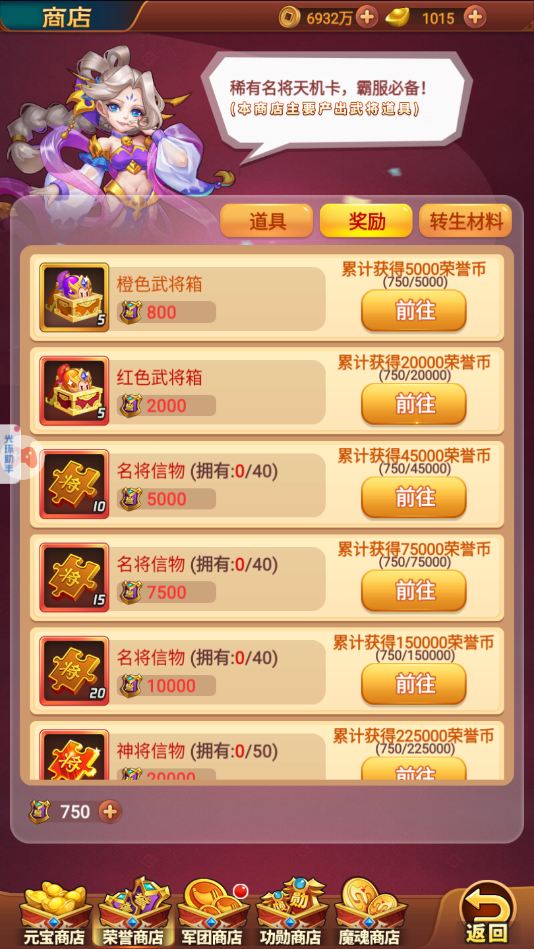 1、可以兑换黄色武將箱、招募令、名将信物、名将天机卡、橙色武将箱、红色武将箱、神将信物、神勇之魂、英雄热血、无敌铁胆、坚定石心。
