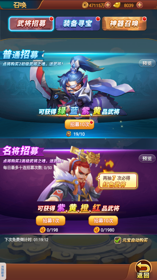 1、普通招募:可获得绿、蓝、紫、黄品质武将,其中黄品质武将就是五星武将,