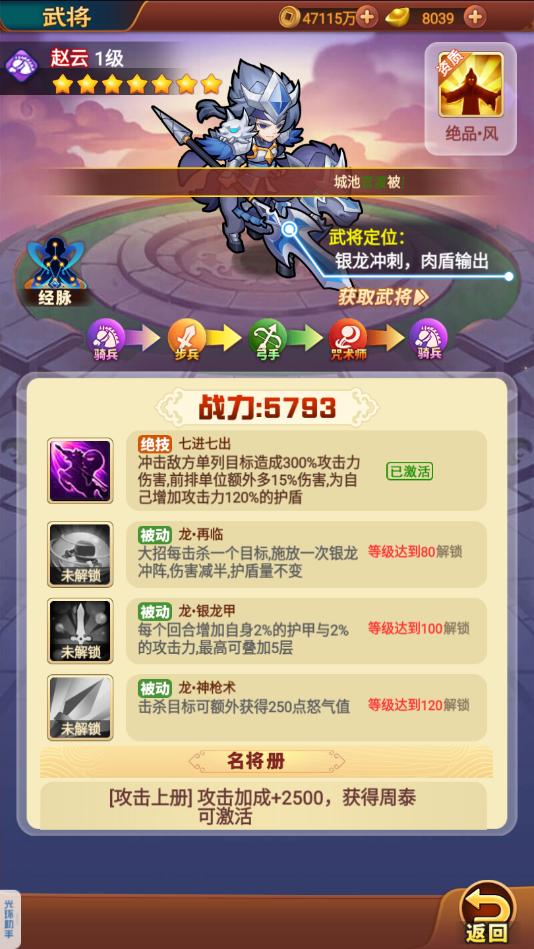 (1)角色特性:初始七星角色,绝品·风生命提升8%,命中提升6%,属于骑兵阵营克制步兵,被咒术师所克制。