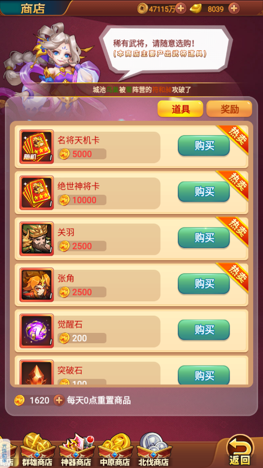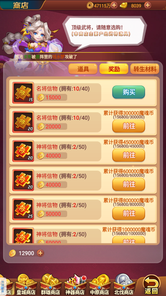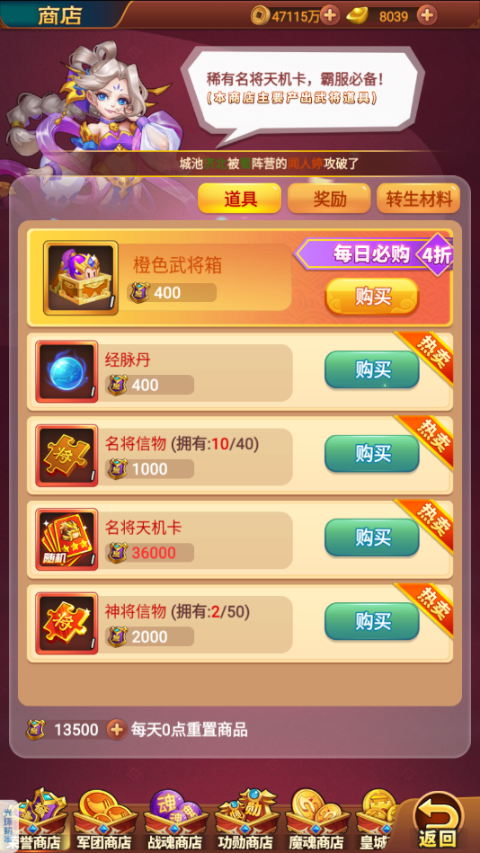1、可以兑换黄色武將箱、招募令、名将信物、名将天机卡、橙色武将箱、红色武将箱、神将信物、神勇之魂、英雄热血、无敌铁胆、坚定石心。