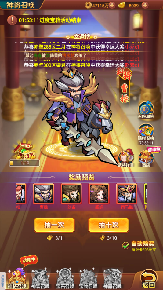 3、概率公示:神装召唤:神将&名将1%;7星武将10%;6星武将44%;武将卡18%;5星武将27%;神殿币100%。