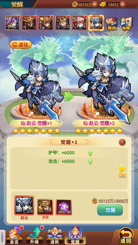 (4)武将觉醒:武将觉醒所带来的全属性加成是最夸张的,但同时也会消耗指定的武将,后期平民玩家的神武将上不了场的主要原因就是持有量太少了。