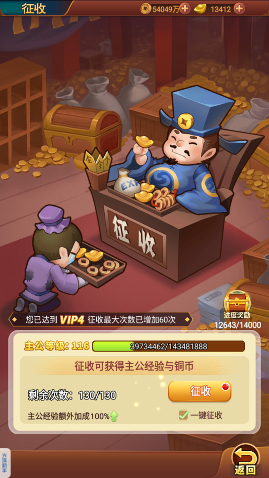 3、征收系统和挂机系统是一个类型的,玩家自身的等级越高那么使用这个方法获取的经验值就会越多,合理运用才会得到更多经验。